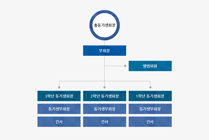 총동기생회는 각 학년별 동기생회장 1명(총동기생회장 학생은 4학년 동기생회장 학생이 겸임), 동기생 부회장 1명으로 구성되고 4학년의 경우에는 졸업앨범을 담당하는 앨범위원 1명이 포함됩니다. 동기생회는 각 학년별로 한 팀을 이루어 선거에 출마하여 동기생 투표로 선출됩니다.