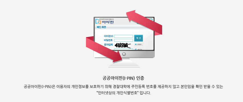 경찰대학은 사용자의 개인정보보호를 위해 2013년 11월 25일부터 공공아이핀(I-PIN) 전용 서비스로전환 되었습니다. ※ 경찰대학은 주민등록번호 등 개인고유식별번호를 처리 및 수집하지 않습니다.